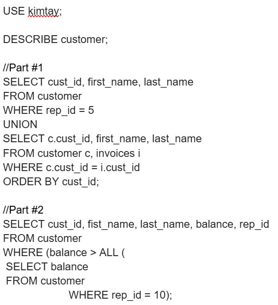 Part #1 and Part #6 of this assignment is unique because of its use of a UNION statement  and an ORDER BY statement. UNION statements are used in database management systems to conjoin two SELECT statements to form one table. The ORDER BY statement is used in SQL to order the elements in a table by a certain factor, for instance, if I have a column of customer ID numbers in a table (for simplicity we’ll call this column cust_id). Then I have a SELECT statement that selects some other columns (customer, sales_rep, etc.). Then I ORDER BY cust_id, this means that the rows of the list will be ordered by the cust_id from lowest to highest.