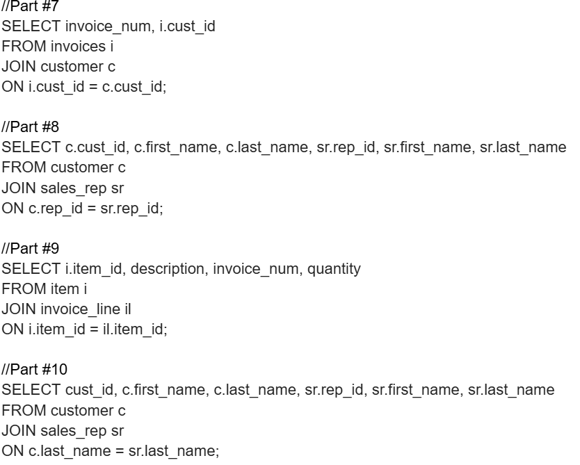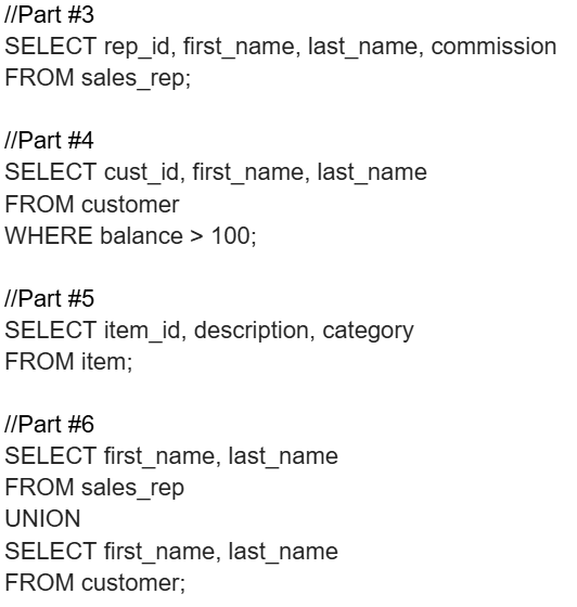 I started with the easiest parts, the simple SELECT statements, where the programmer can select parts of a database table based on the column name and form them into a new table with only those columns. The programmer can also limit the data let into the table by the use of WHERE statements. Which could limit the data based on stated conditions like “rep_id = 5”. The parts that were simple like this were parts #3 – #5, which mainly consisted of making a new table by using preexisting columns using FROM statements and limiting the data shown through WHERE statements.