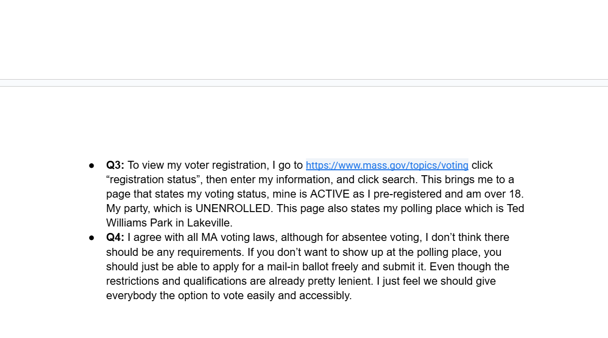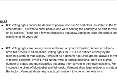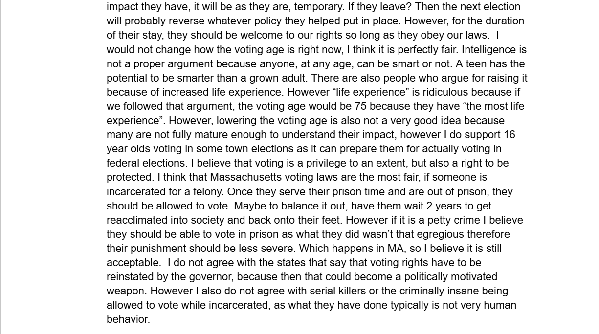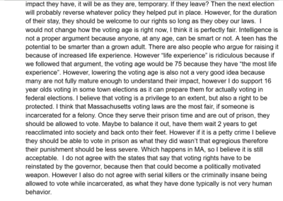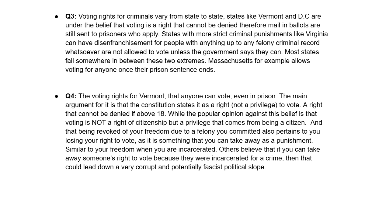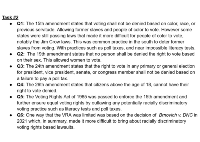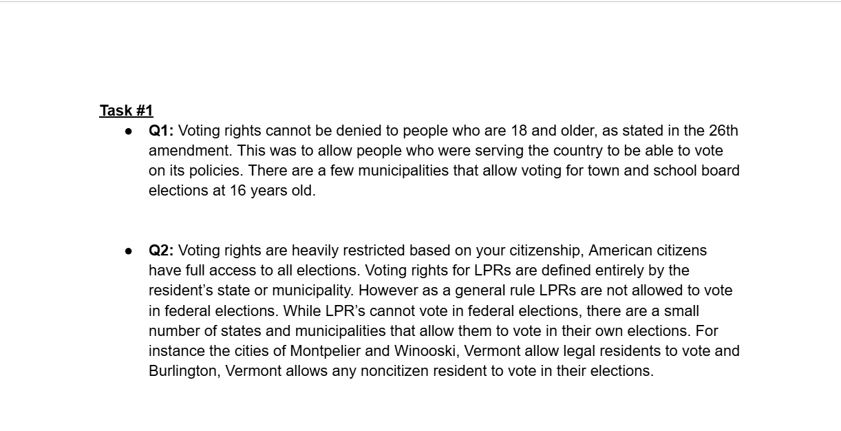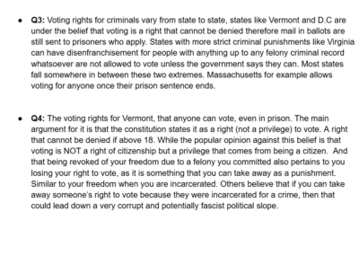 This was an experimental assignment by our Honors U.S Government teacher, the idea was an assignment that was worth the entire grade for the two week cycle and it was a culmination of everything we had learned that cycle. This cycle was about voting rights in the United States. There were several tasks that asked us questions regarding constitutional rights connected to voting age and who can vote; however we also went further into individual states’ voting rights.
