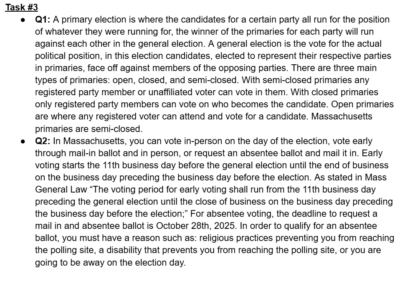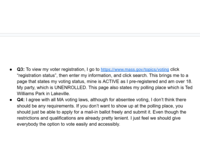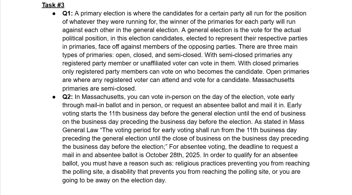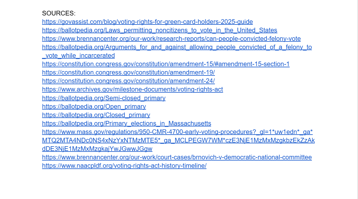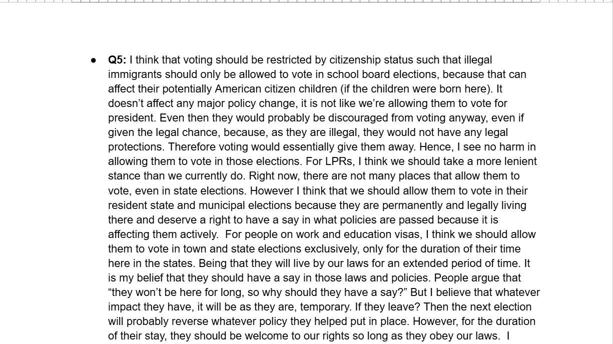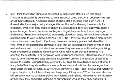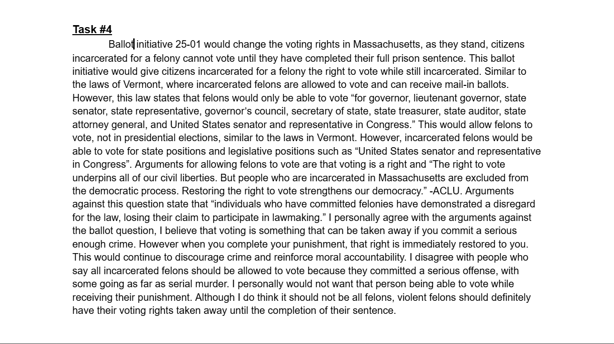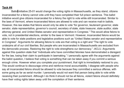 This was an experimental assignment by our Honors U.S Government teacher, the idea was an assignment that was worth the entire grade for the two week cycle and it was a culmination of everything we had learned that cycle. This cycle was about voting rights in the United States. There were several tasks that asked us questions regarding constitutional rights connected to voting age and who can vote; however we also went further into individual states’ voting rights.