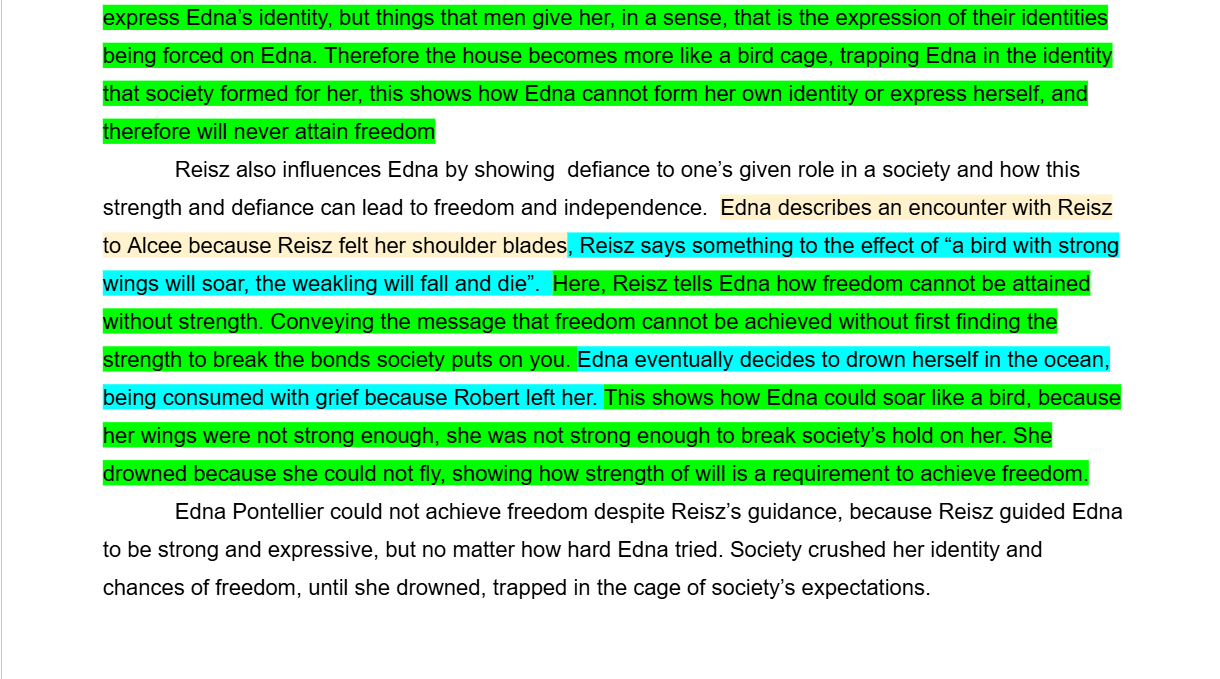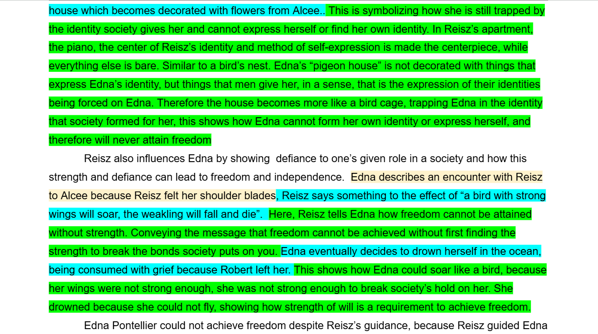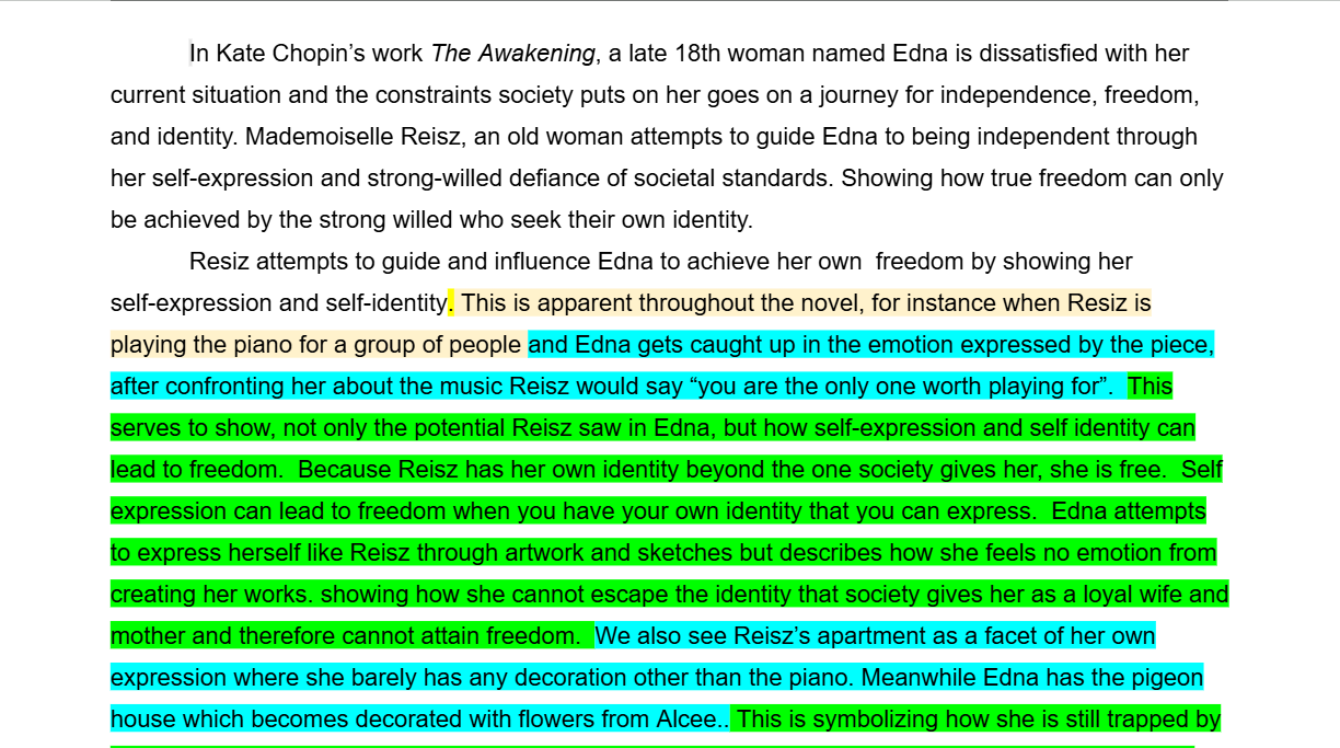 In our AP Literature class we had been reading and analyzing feminist authors, however we only read one book: The Awakening by Kate Chopin. When the two week cycle was coming to an end we wrote a literary analysis on the piece to help us prepare for the AP Literature exam later in the year. This is a normal routine, these essays, but this one is the best one I have written so far. I definitely could have done better on it but overall it is an improvement.